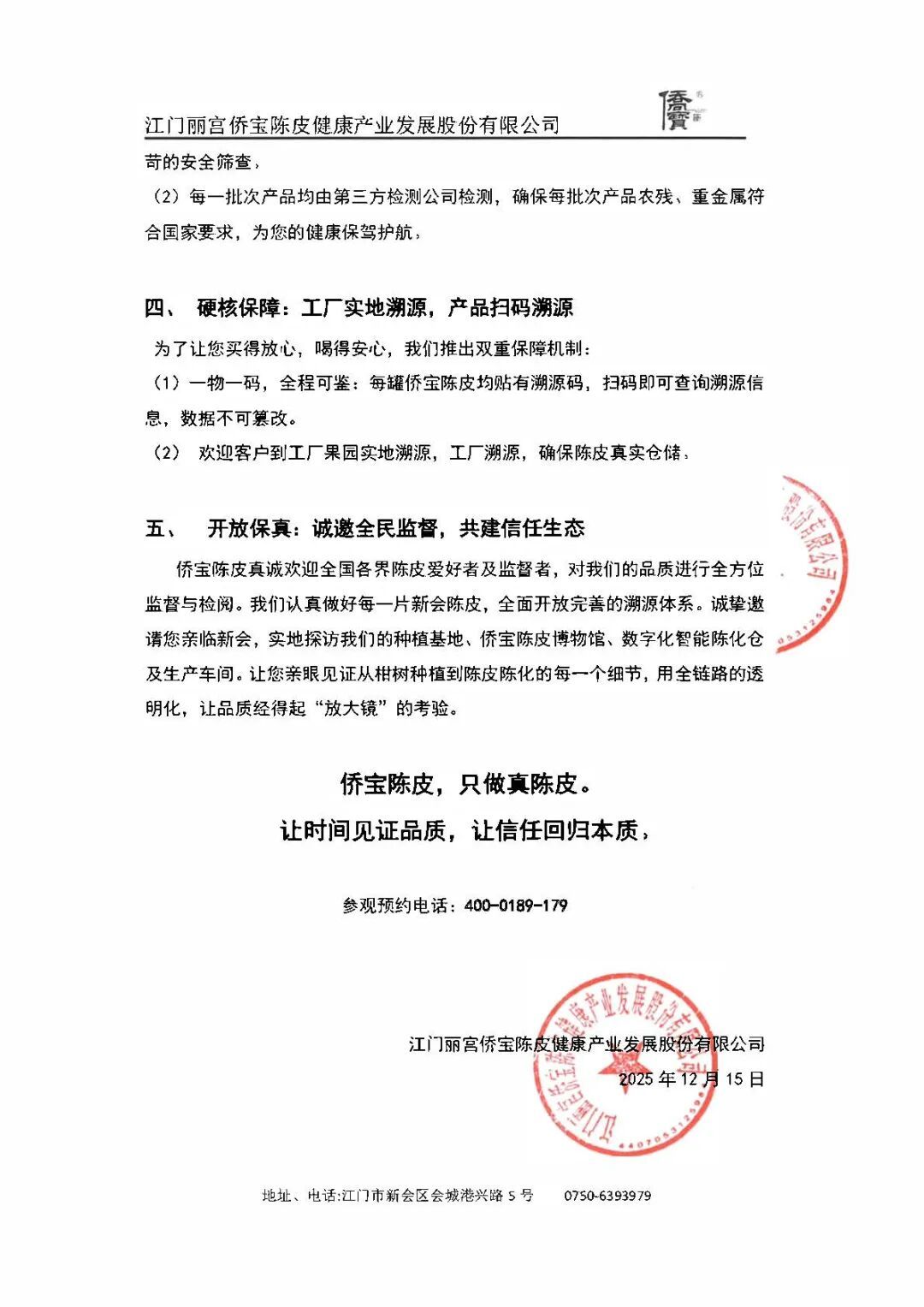 行为新会陈皮产业龙头企业之一,江门丽宫侨宝陈皮健康产业发展股份有限公司最初发布声明——《侨宝说念地陈皮品性保真声明》,强调“真”是陈皮的底线,更是品牌的生命线,濒临行业信任危境,侨宝不笼罩、不掩蔽,留神高兴:产区保真:着力“新会陈皮地舆记号居品”,拒却外地杂皮;年份保真:着力“当然陈化”,拒却科技作念旧;检测保真:严选“侨宝标准”,拒却农残超标;硬核保险:工场实地溯源,居品扫码溯源;洞开保真:诚邀全民监督,共建信任生态。