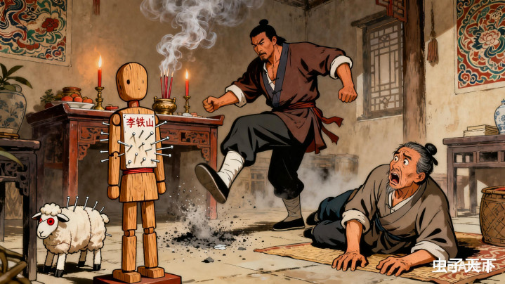 铁山攥着鱼篓闯了德贵家,门没关,屋里正点着香,地上摆着个小木东说念主,背后贴着“李铁山”,胸口扎着根银针,掌握还放着只扎了眼的布羊。